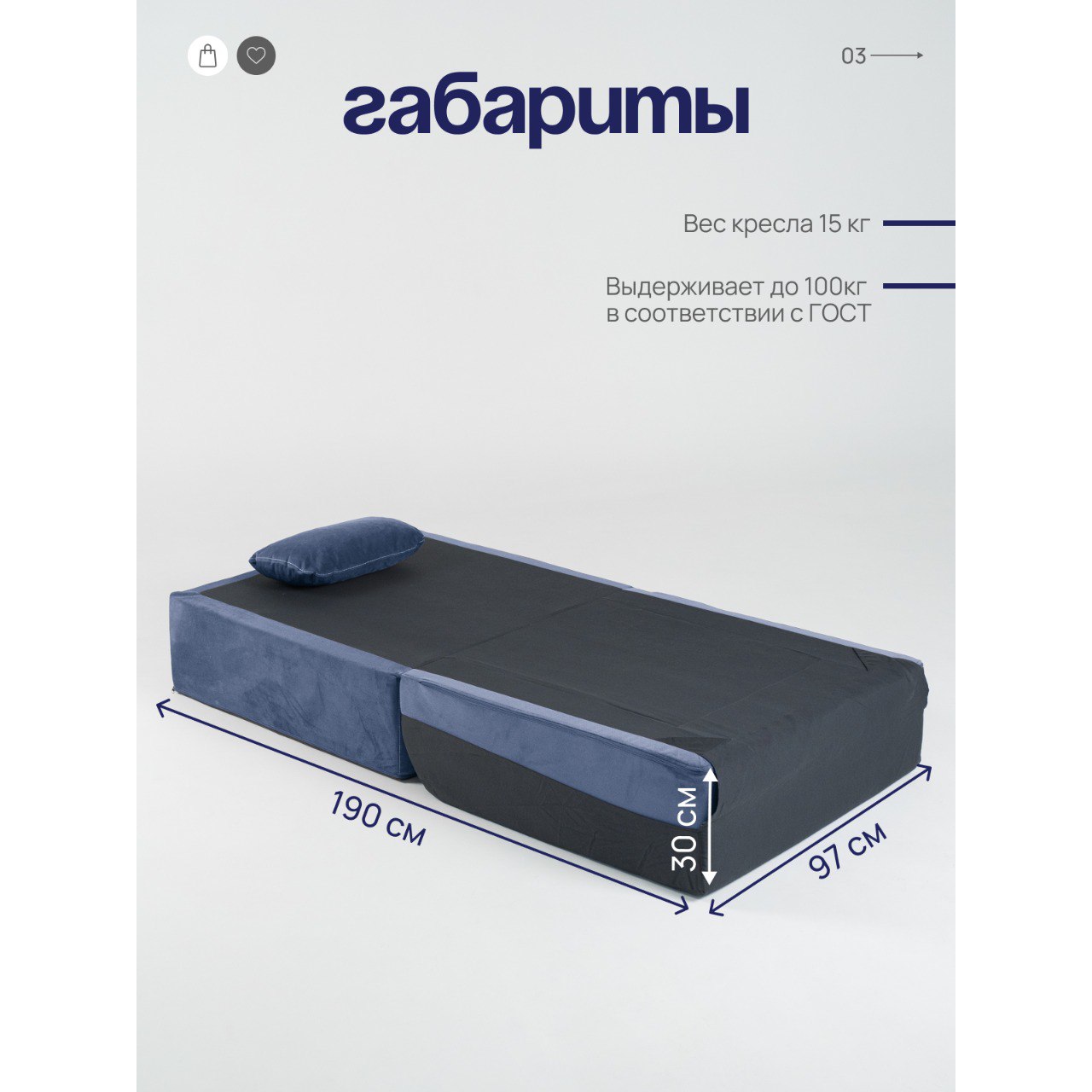 Изделие создано полностью из качественного ППУ марки ST толщиной 200 мм. Мико изготовлено из износостойкого велюра, который имеет 50 000 циклов по мартиндейлу (по стандарту необходимо 20 000). Максимальная нагрузка 100 кг.