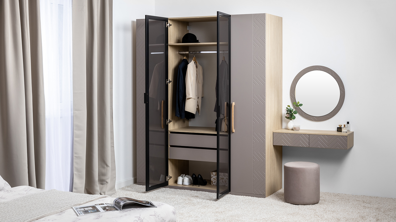 Подвесные консоли и велюровый пуф в тон фасадов дополняют сдержанный и благородный облик спальни Амьен.