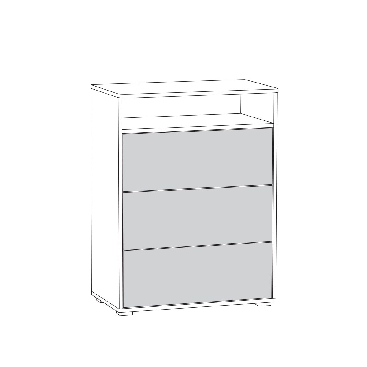 Комод имеет верхнюю открытую нишу и три выдвижных ящика для одежды, вещей, игрушек, документов и всего, что Вы захотите хранить в комоде. Корпус и фасады мебели изготовлены из экологически чистой ламинированной ДСП 16 мм., торцы окромлены ПХВ плёнкой 0,4 мм. Лицевая фурнитура выполнена из черного пластика. Выдвижные ящики на шариковых направляющих полного выдвижения обеспечивают длительную и тихую эксплуатацию.