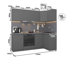 Размеры угловой кухни 2,1х1 м. она идеально подходит для помещений с ограниченным пространством.