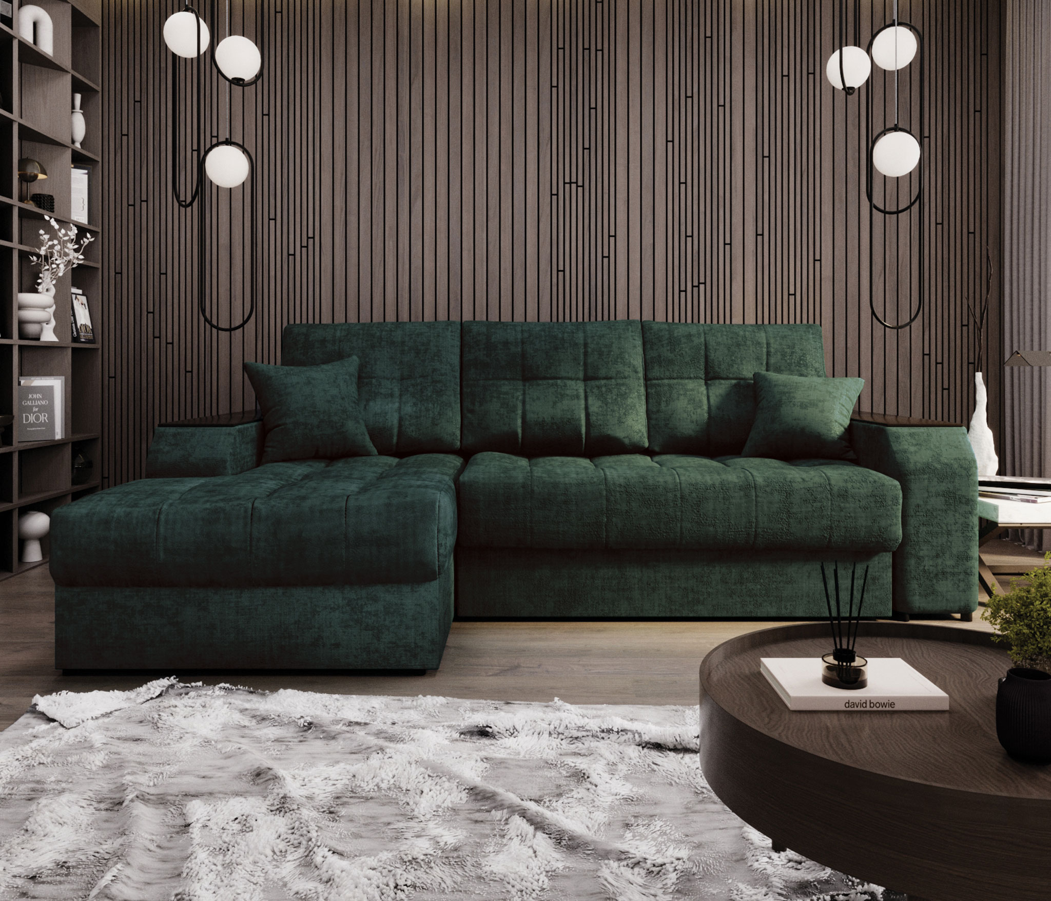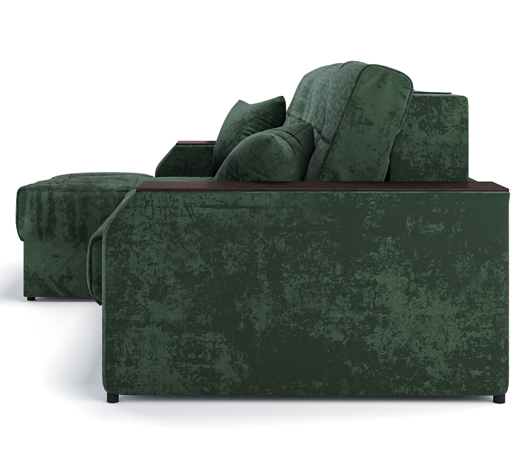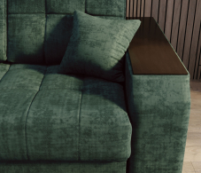 Оттоманка имеет оригинальную Г-образную форму, обтекающую подлокотник спереди. Это придаёт дивану изысканный вид и, когда диван установлен подлокотником к стене, отсутствует щель между оттоманкой и стеной, что удлиняет спальное место. Под декорами в подлокотниках скрыты два вместительных короба. В них можно хранить как постельное бельё, так и множество вещей, которым иногда сложно найти место, например, игрушки и даже инструменты. Мягкие приспинные подушки создают дополнительный комфорт во время сидения.Декоративные подушки при желании можно подложить под спину или голову. Задняя планка придаёт жёсткость конструкции и ограничивает соприкосновение со стеной во время сна.Благодаря утяжкам на сидении дивана ткань не растягивается и не собирается в складки.