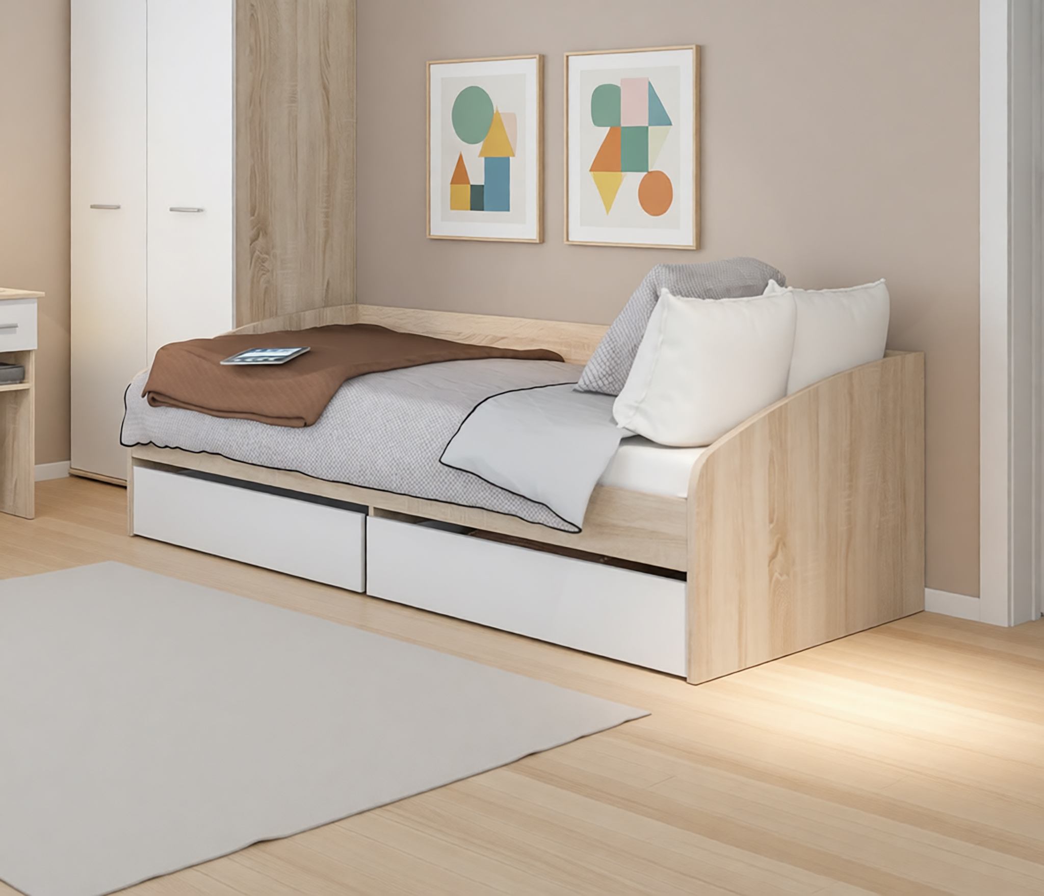 Качественная фурнитура со встроенными доводчиками позволяет плавно открывать, закрывать двери и ящики. Направляющие шариковые полного выдвижения.