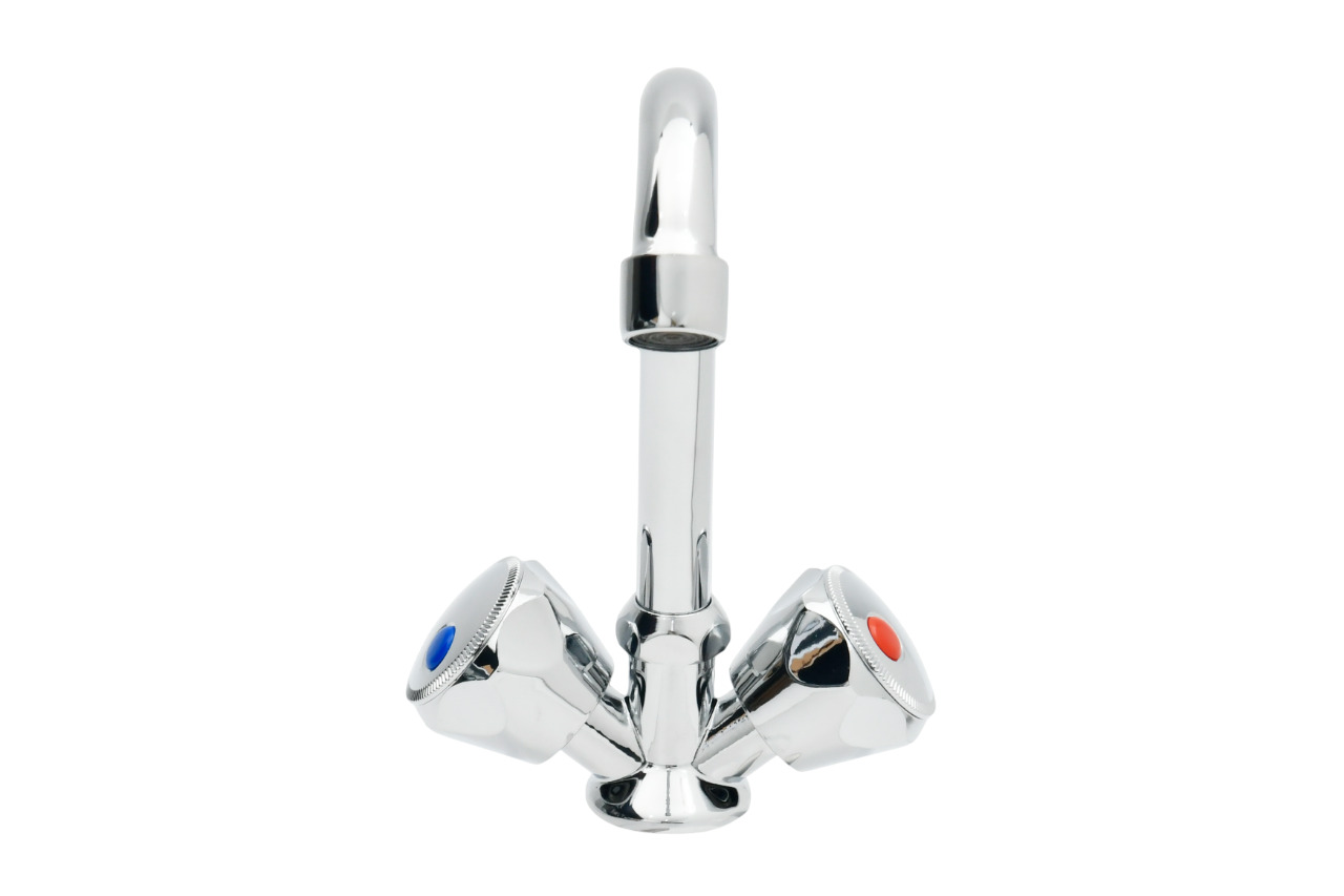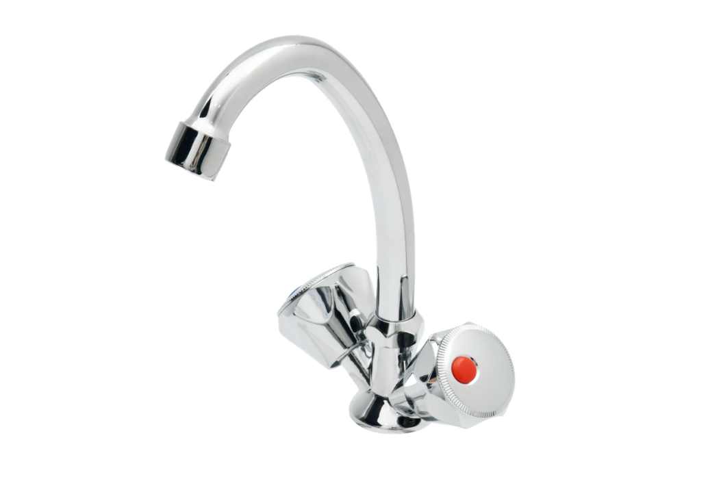 Смеситель для кухни из латуни, с поворотным изливом, двухвентильный. Фирменная картонная упаковка.