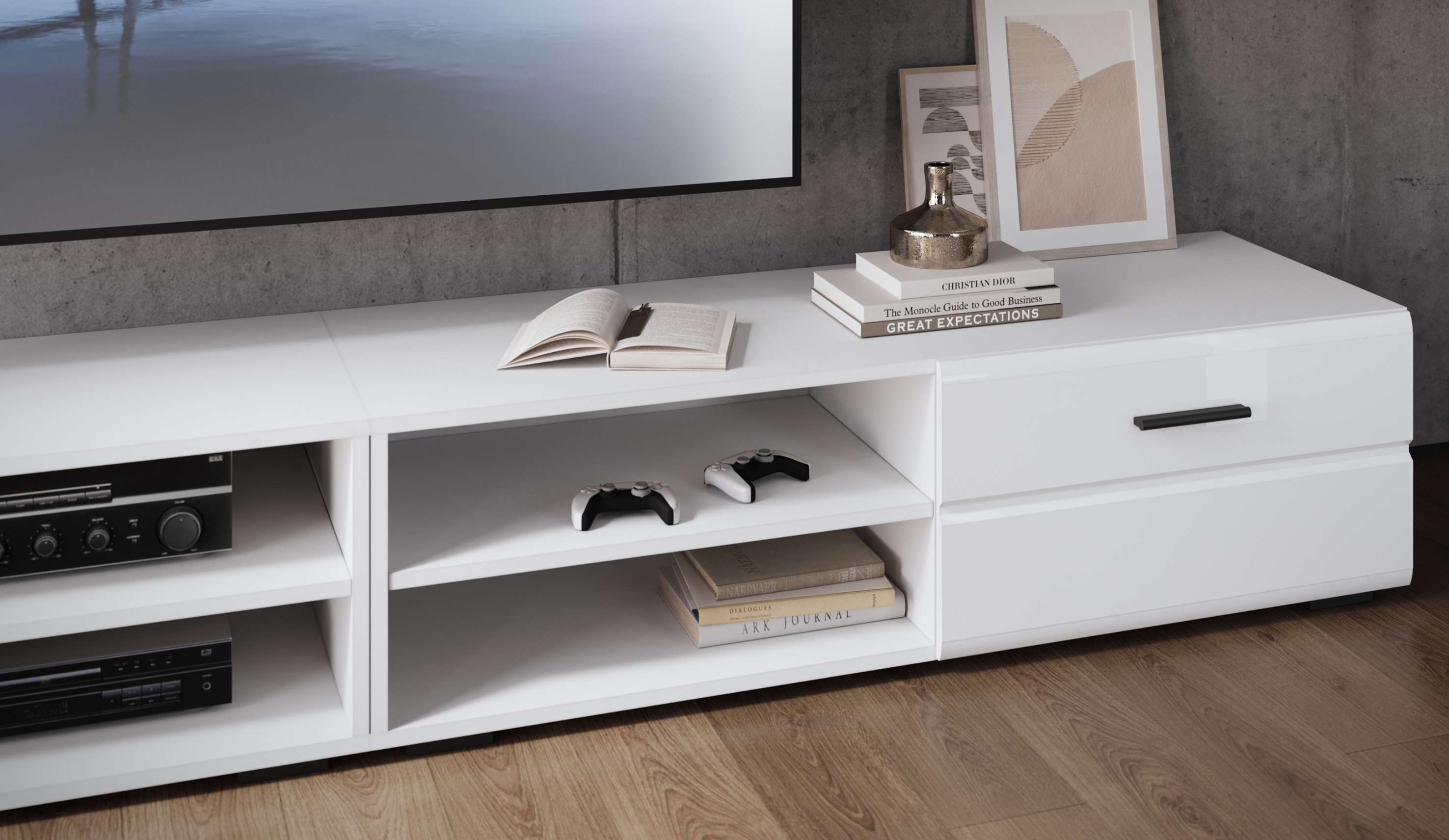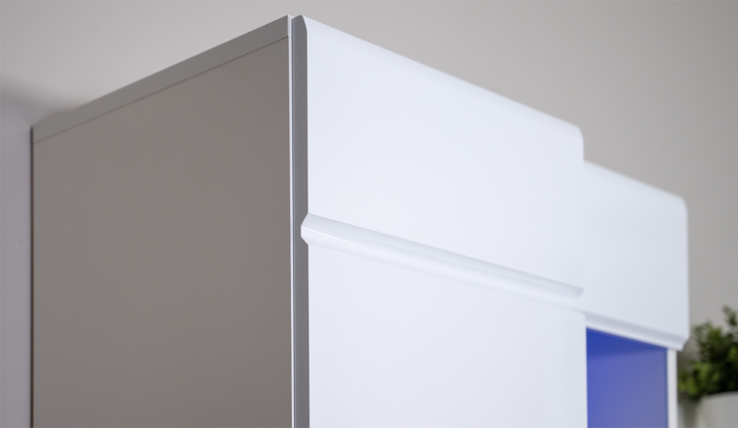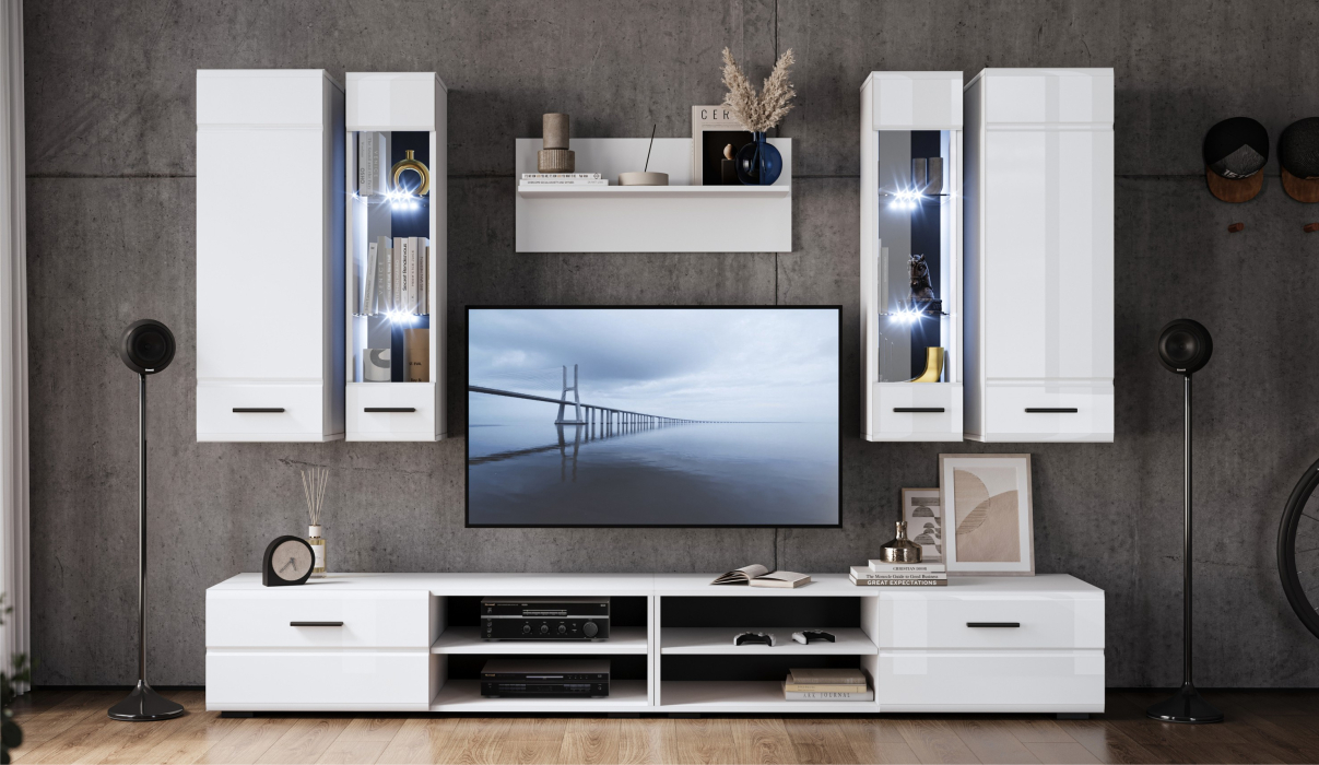 Стенка Кай - это универсальный комплект модулей в современных нейтральных тонах, простота форм и лаконичность которого позволяют вписаться в любой интерьер. Фасады МДФ с витринами и горизонтальной фрезеровкой добавляют динамики, делая композицию более яркой и выразительной. Контрастная задняя стенка и ручки черного цвета подчеркивают стиль и индивидуальность, оттеняют белоснежные глянцевые фасады. Функциональные шкафы и тумба для ТV обеспечивают удобство и простоту использования.