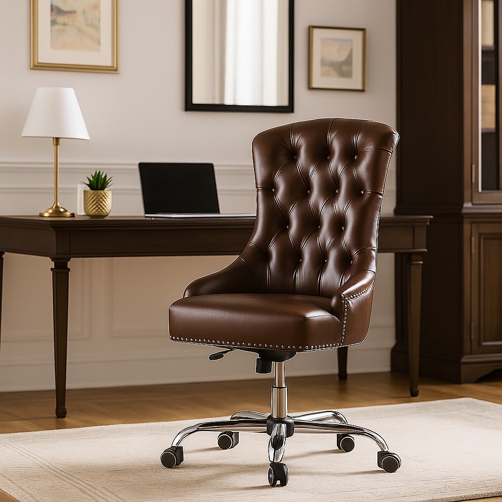 - На механизме — для тех, кто ценит функциональность. Стул оснащается поворотным механизмом с колёсиками, что обеспечивает лёгкость перемещения и свободу движений. Идеально подходит для рабочих зон, кабинетов и гостиных.
