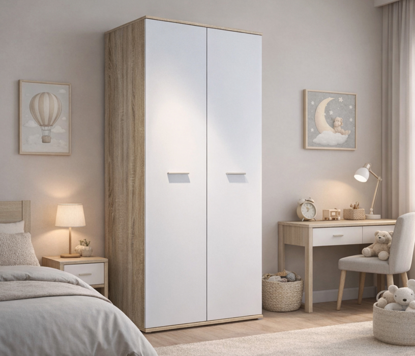 Габаритные размеры шкафа – ширина 90 см, высота 191 и глубина 55 см, позволят разместить его в небольшой прихожей, детской комнате или кабинете. Визуально шкаф можно разделить на два отделения. Большое отделение со штангой для развешивания верхней одежды и секция с тремя вместительными полками. Оба отделения объединены верхней антресолью. Произведен шкаф из современного и качественного материала. Внешняя отделка выполнена в двух оттенках. Цвет корпуса «Дуб Сонома», а фасадные поверхности – в белом цвете.