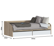 Кровать из детского гарнитура «Мамбо» – симпатичная и комфортабельная модель, воспользоваться которой могут даже взрослые члены семьи. Занимая не так уж и много места, она выделяется своей функциональной значимостью. Три в одном. Днем это вполне приличный диванчик, ночью полноценное спальное место шириной 95 см, к тому же, это и система хранения постельных принадлежностей, так как модель оборудована двумя объемными выдвигающимися ящиками. Кровать собрана из мебельных щитов повышенной прочности с износостойким поверхностным покрытием приятного пастельного оттенка «Дуб Сонома». Ящики и фасады к ним изготовлены из ДСП песочного цвета. Неброское сочетание цветов вносит в интерьер гармонию и умиротворение, что бывает нелишним, когда требуется успокоить разыгравшегося ребенка.