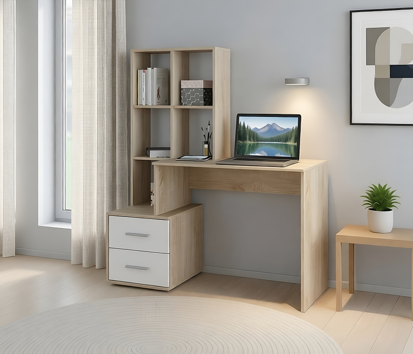 Стол Мамбо СБ-2998 – удобное и практичное рабочее место. Стол идеален в комнате школьника или студента, в кабинете или в офисном интерьере. Габаритные размеры – ширина 120 см, высота 143 см и глубина 50 см. Под рабочей поверхностью расположена тумба с двумя выдвижными вместительными ящиками. Над рабочей поверхностью находятся удобные для хранения документов и книг полки. Стол производится из экологичного и прочного материала. Отделка комбинированная. Корпус, рабочая поверхность и поверхности полок выполнены в цвете «Дуб Сонома», а фасадные поверхности – белые. Материал отделки устойчив к влаге и воздействию бытовых чистящих средств. Стол Мамбо может быть как отдельным предметом мебели, так и частью гарнитура.