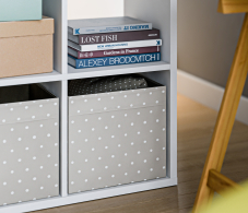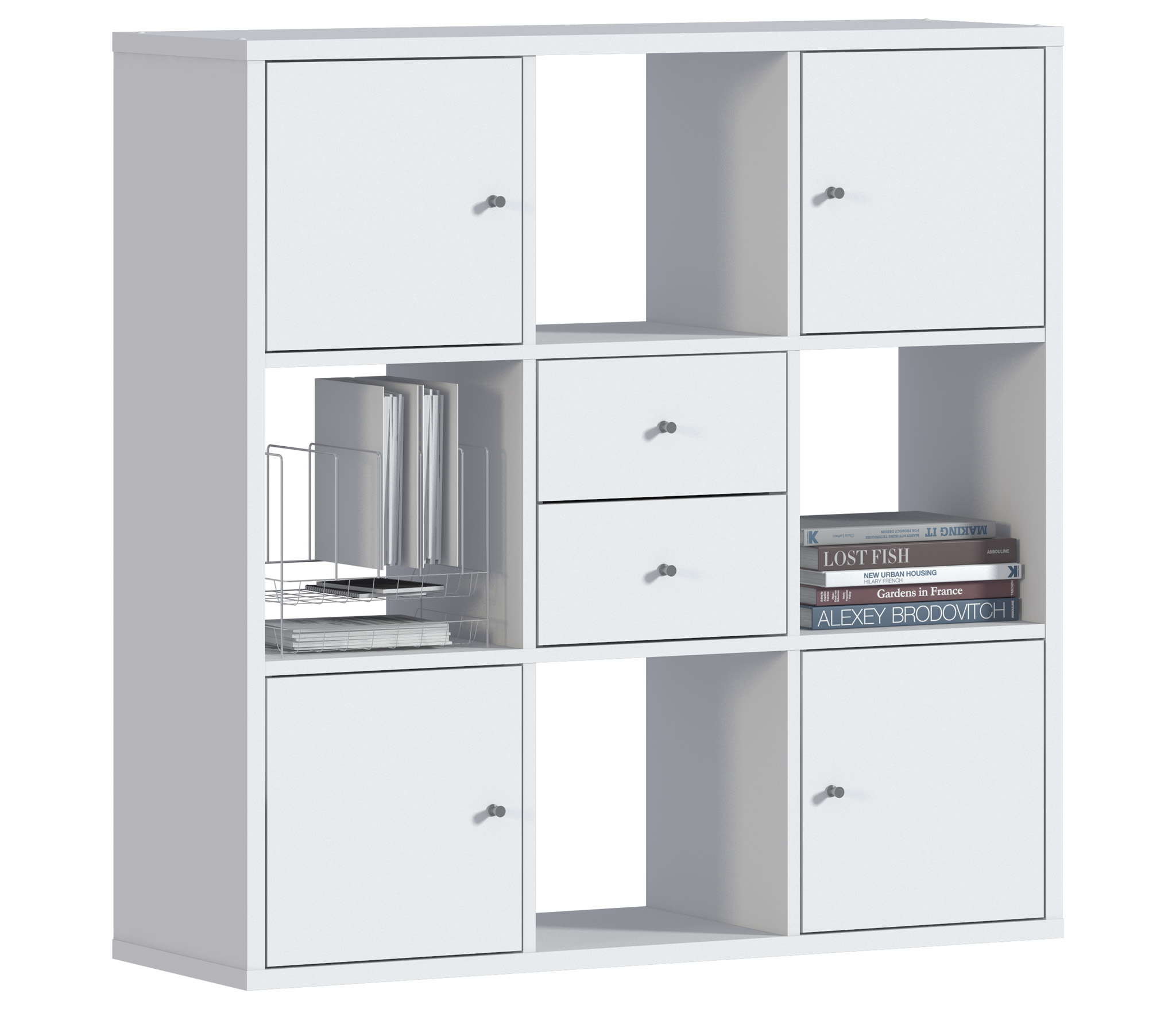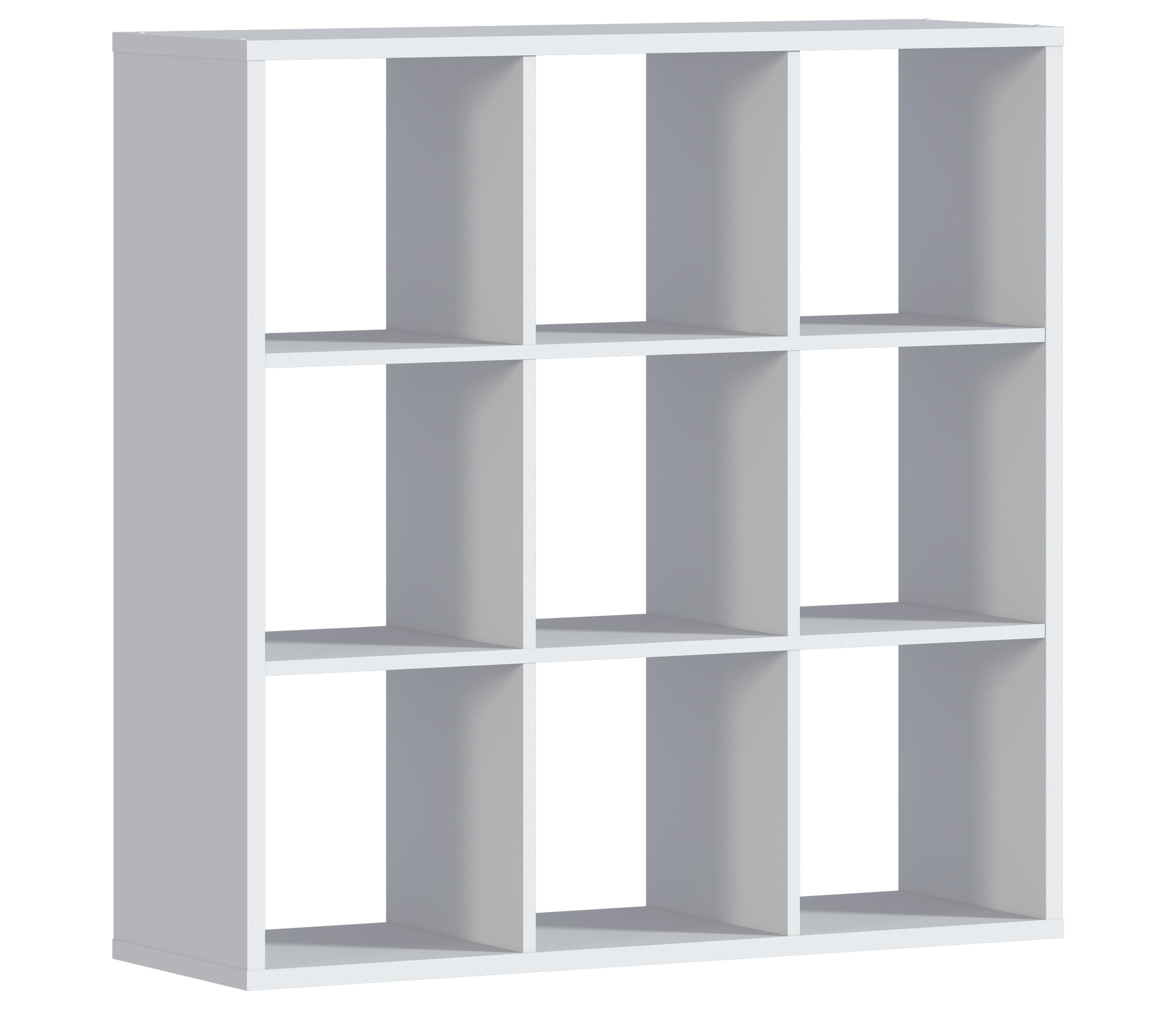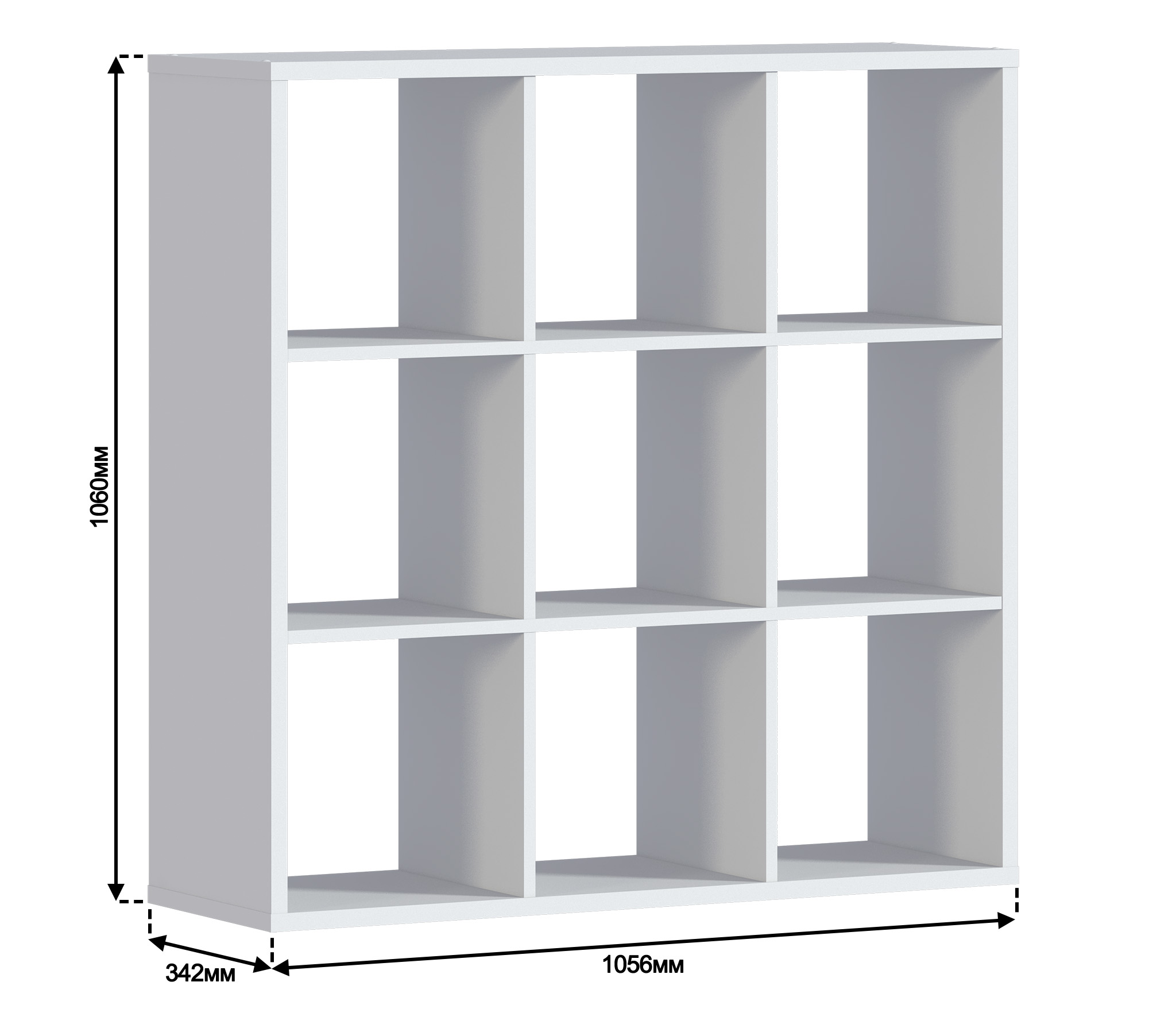 Габаритные размеры – ширина 105 см, высота 106 см и глубина 34 см. Конструктивно стеллаж состоит из девяти квадратных секций. Стеллаж можно применять для зонирования пространства, устанавливать у стены или в центре комнаты. Выполнен стеллаж из современного и прочного КДСП в белом цвете.