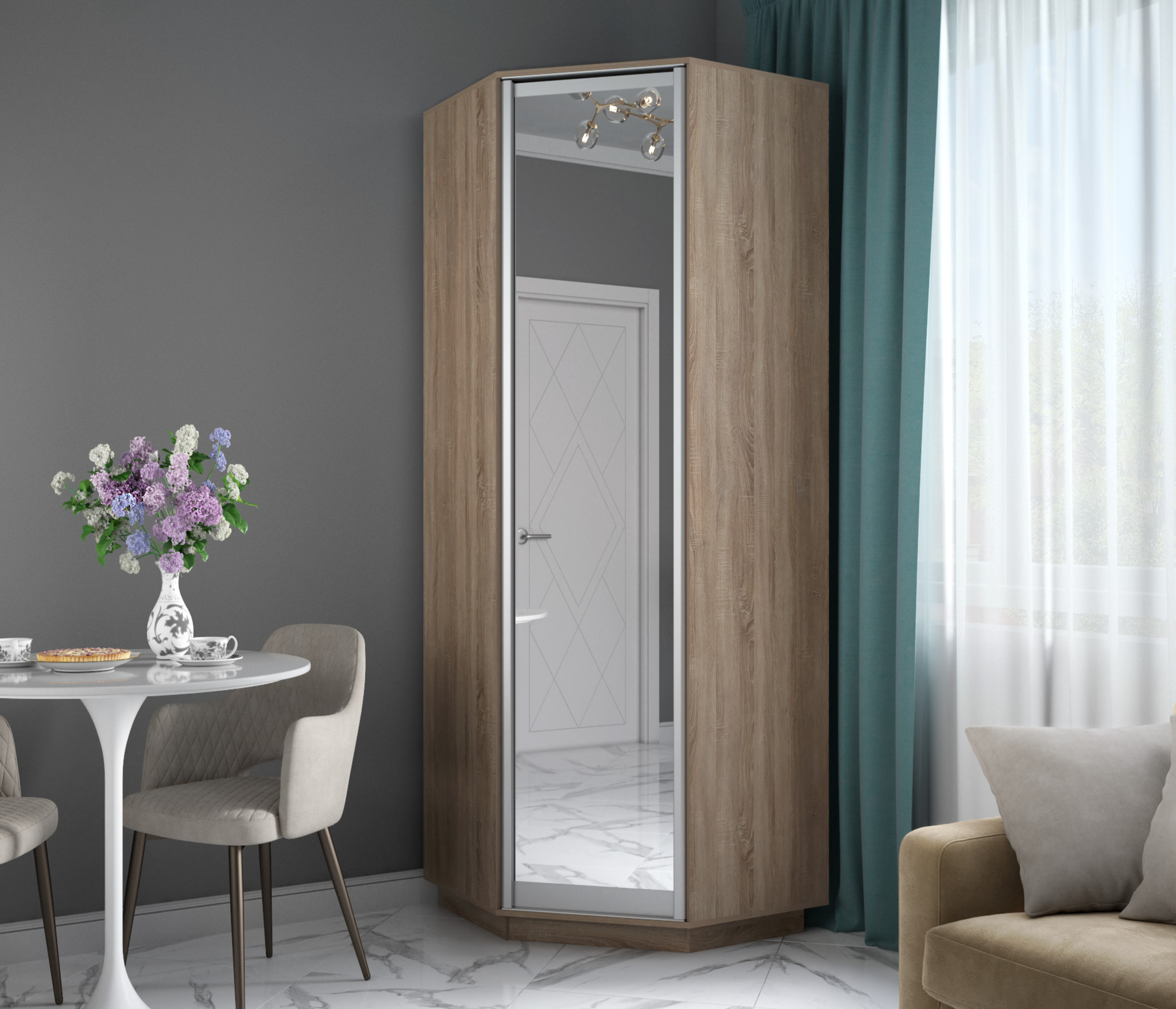 Лаконичный дизайн: монолитный трехпанельный фасад с распашной дверью украшает полноразмерное зеркало в алюминиевом профиле;