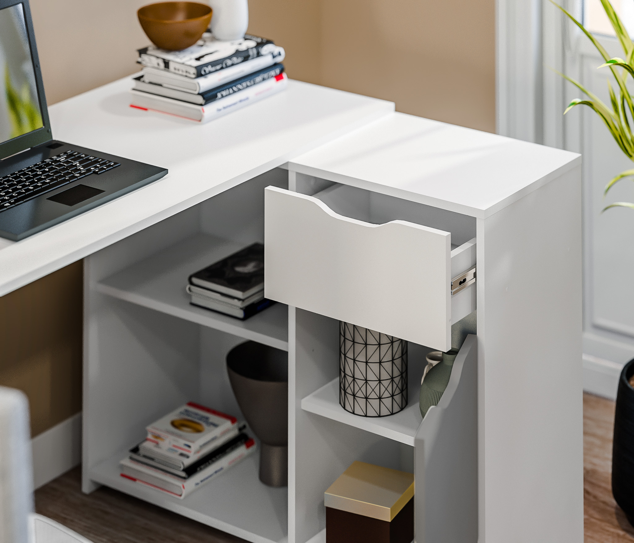 Дизайнерское решение угловой стол с ящиками и полками, в белом нейтральном цвете, без ручек, смотрится очень круто.Цена отличная, подросток в восторге, качественная сборка, доставка в свой день, оператор на связи в течение 2 часов.Спасибо.