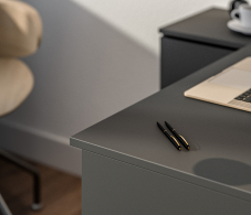 Габаритные размеры – ширина 119 см, высота 75 см и глубина 80 см. Под рабочей поверхностью расположена тумба с открытыми вместительными полками, а также выдвижной ящик и закрытое отделение с отдельной дверцей. Стол произведен из современного экологичного ЛДСП. Возможен как левый, так и правый вариант сборки.