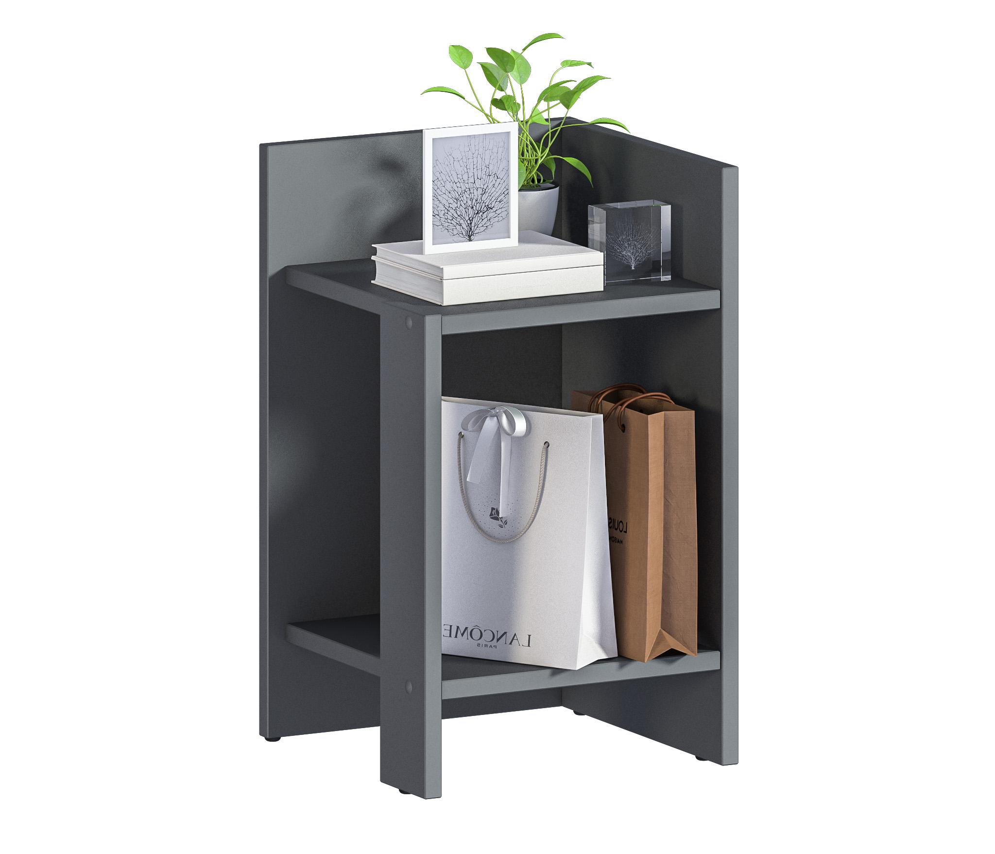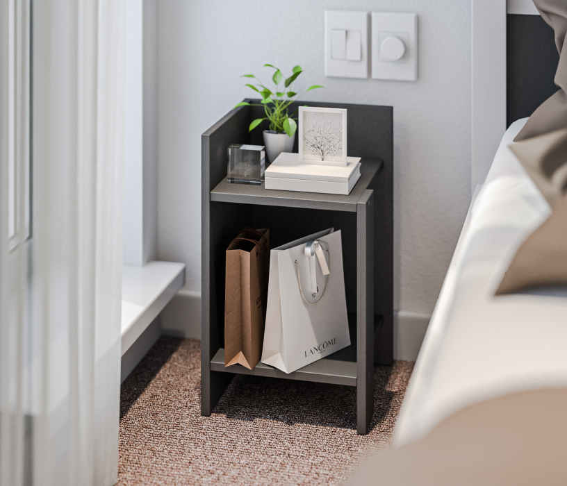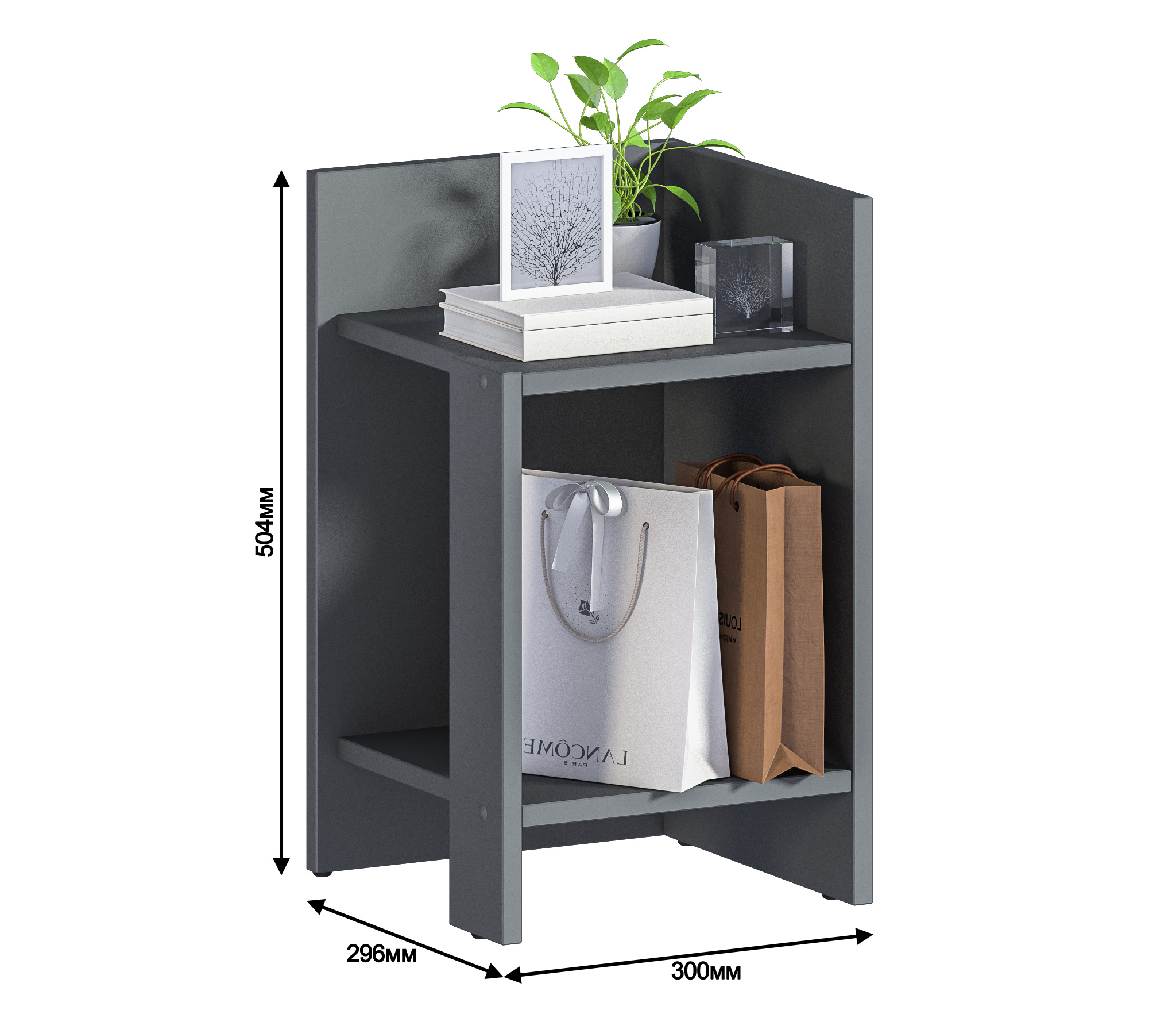 При компактных габаритных размерах – ширина 30см, высота 50,4 см и глубина 29,6 см, тумба довольно вместительная: на имеющихся полочках можно разместить книги, аксессуары и предметы декора. Тумбу можно использовать и как придиванный столик, за которым можно перекусить или выпить чашечку чая.