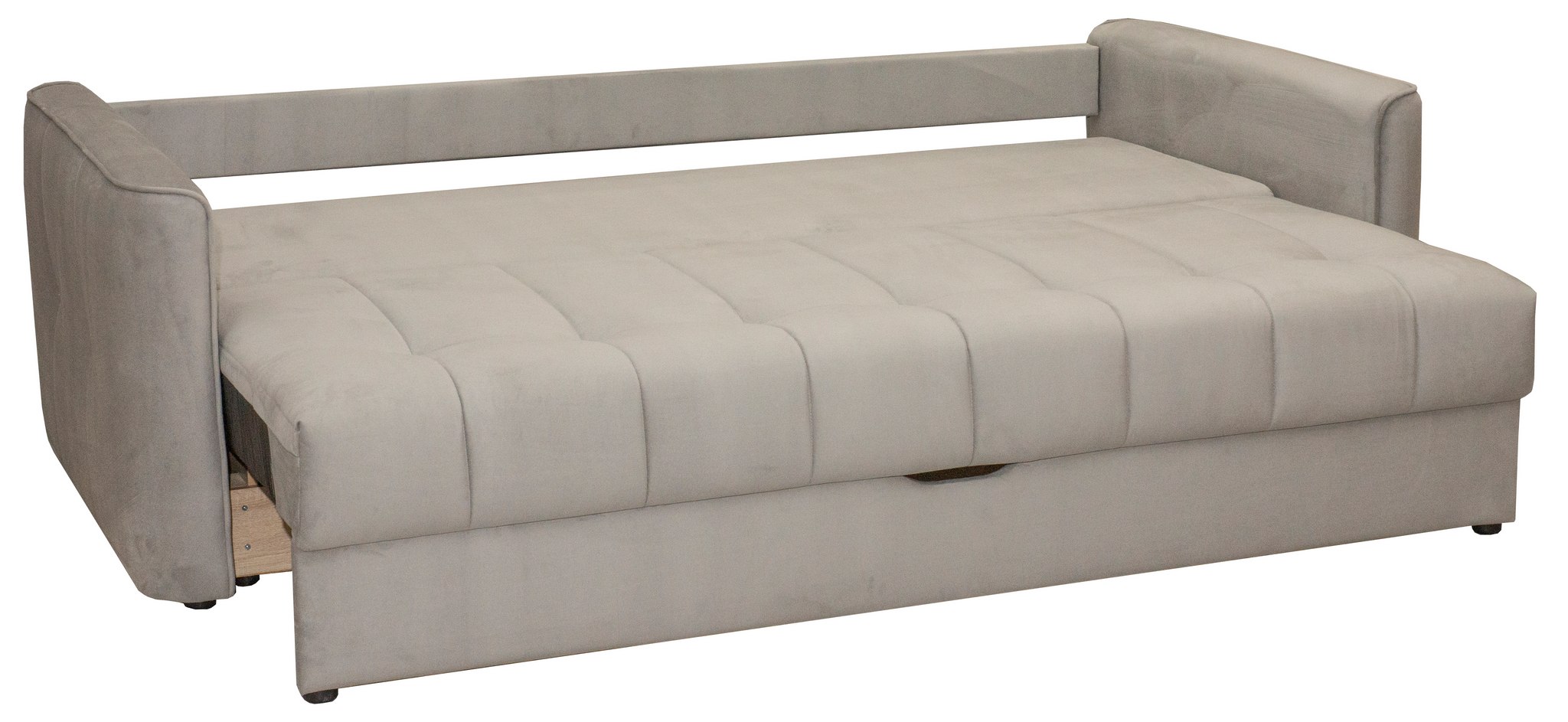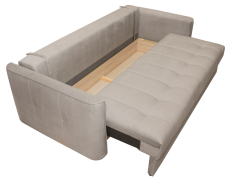 Радиусные углы «сглаживают» изделие. Спальное место легко трансформируется в большую удобную кровать – механизм трансформации «Тик-Так» удобный и лёгкий в эксплуатации. Сиденье создано по технологии «Split Foam». Наполнитель изготовлен из рассечённой анатомической пены, соединённой в несколько слоёв. Сиденье средней жёсткости. Ортопедическое основание «Birch battens» - средней гибкости, на основе берёзовых лат. Идеально подходит для анатомических моделей.