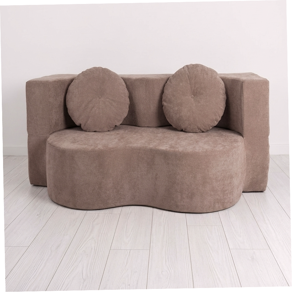 Вес всего 25 кг. Это позволит Вам без усилий поднимать и передвигать малогабаритный трансформер при уборке. Легкость даст возможность перемещать диван-кровать в разные помещения. Благодаря отсутствию твердых элементов в конструкции софа с подлокотниками безопасна для ребенка и идеально впишется в детскую или комнату подростка.