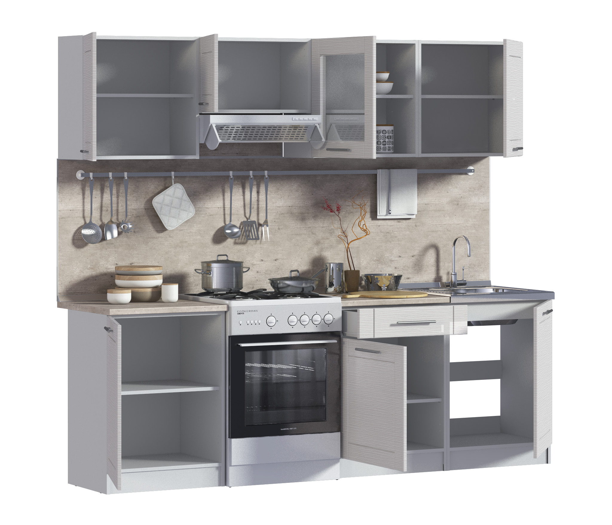 стеновую панель, аксессуары, бытовая техника, мойку и сушку для посуды.